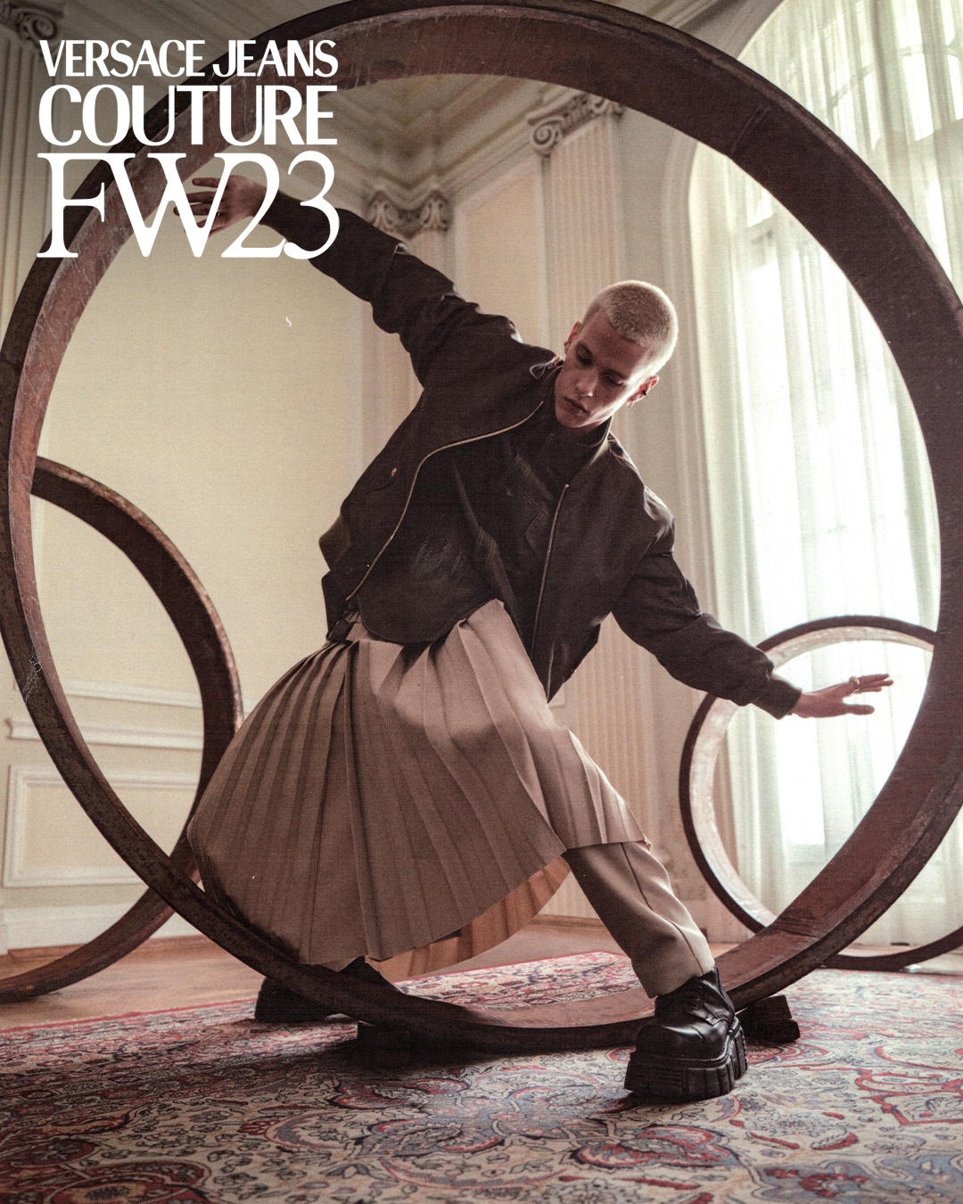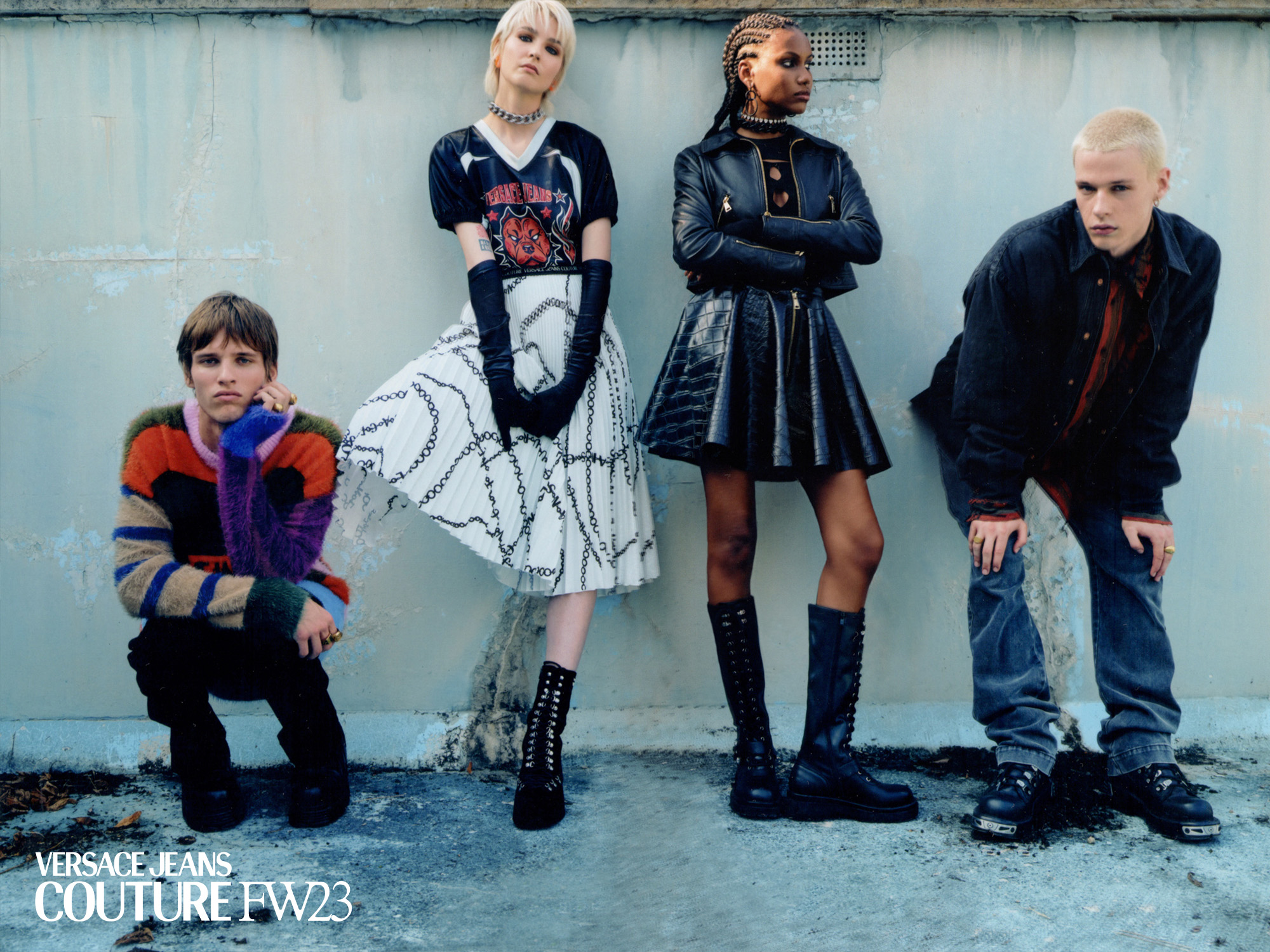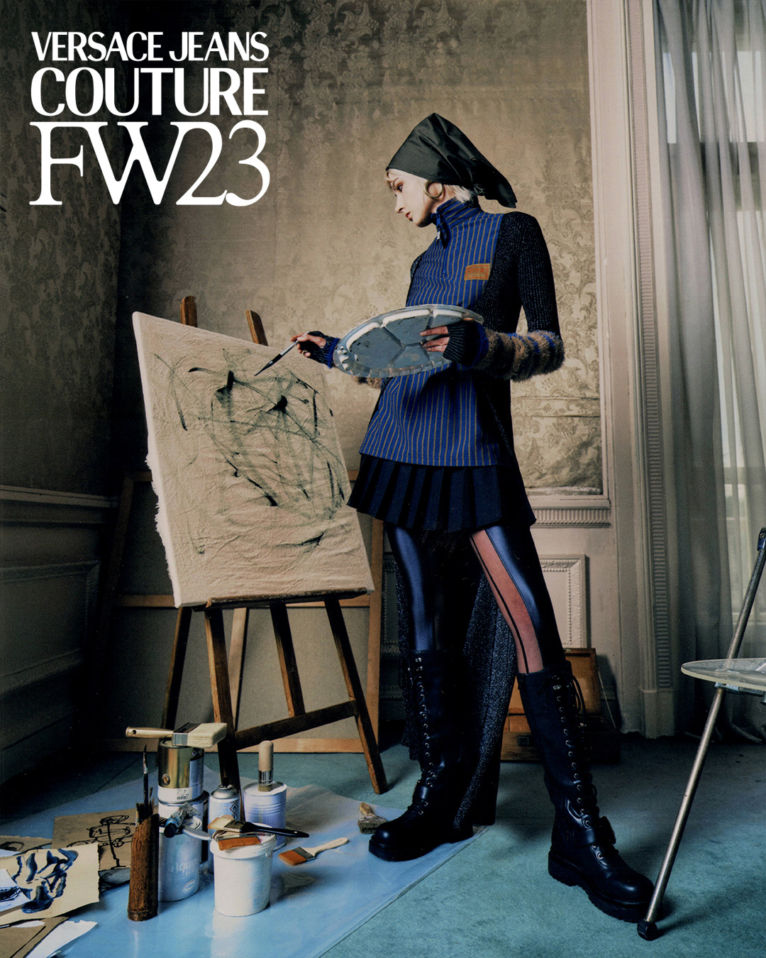 For Versace Jeans Couture's FW23 campaign we explored the sense of opportunity, discovery and inspiration that artists get when they work in a new environment, surrounded by other creatives.