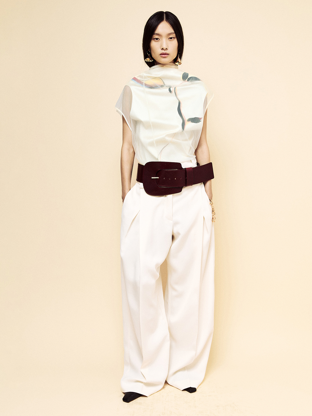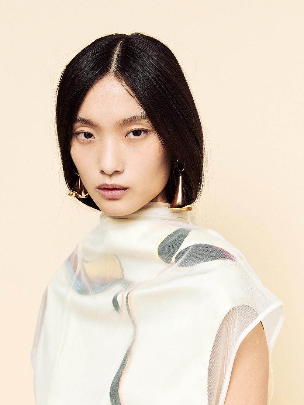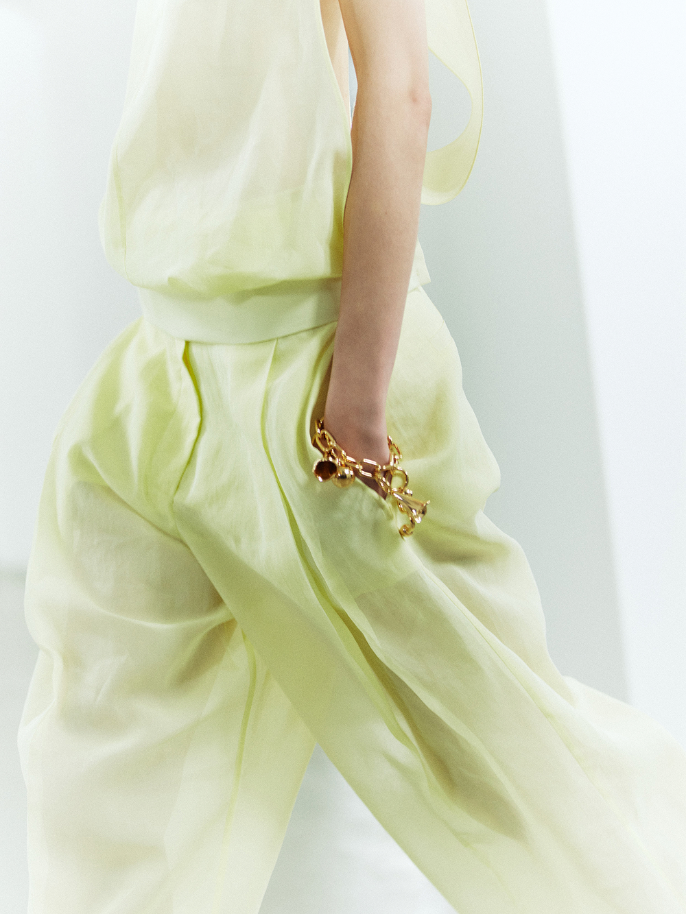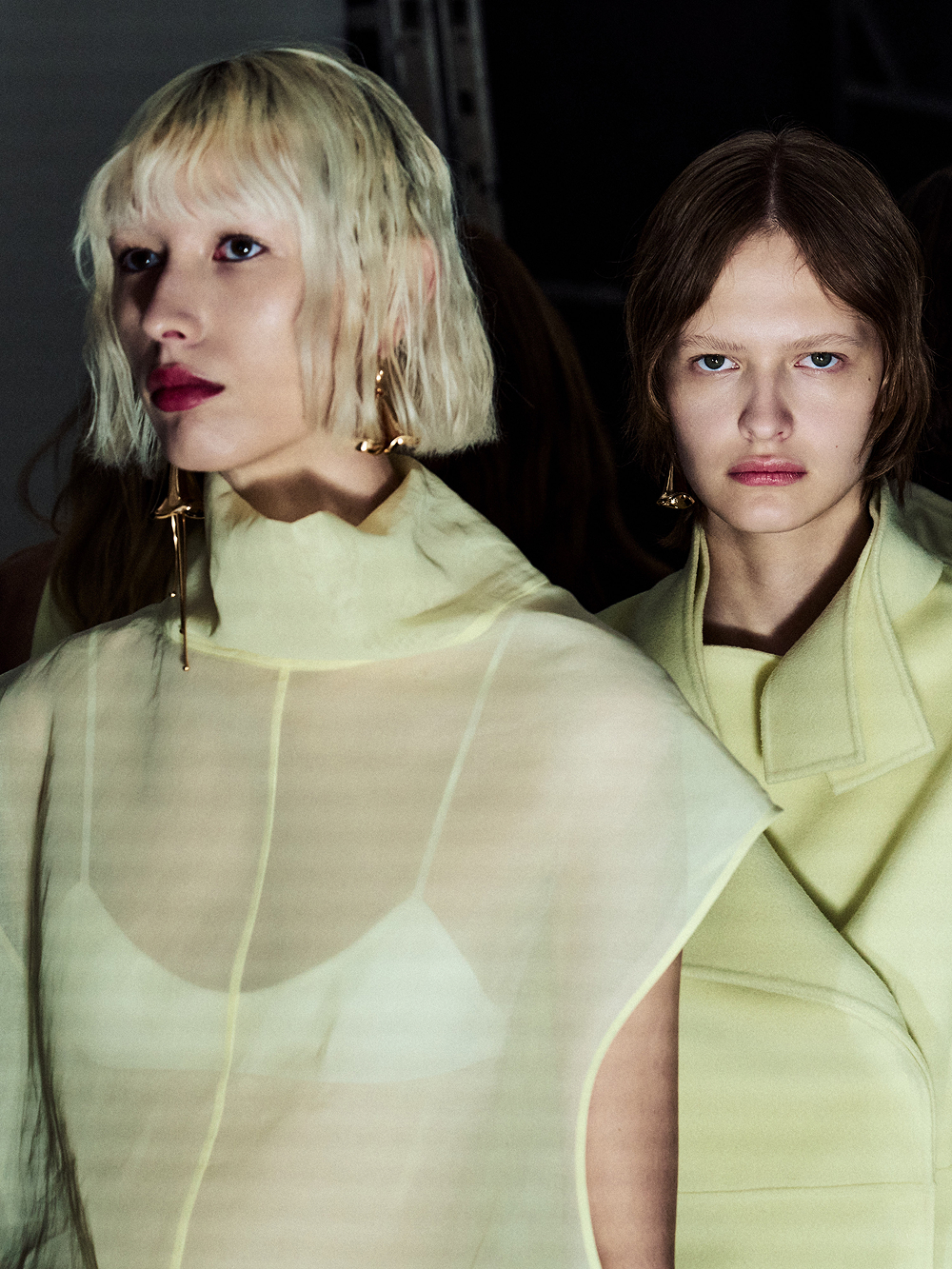 Staged at the historic Frigoriferi Milanesi, the collection experiments with transparency as both surface and language. Layers of gauze and organza refract the body, catching illumination like glass, while pigments—applied with Japanese makeup tools—blur the line between fashion and ritual.