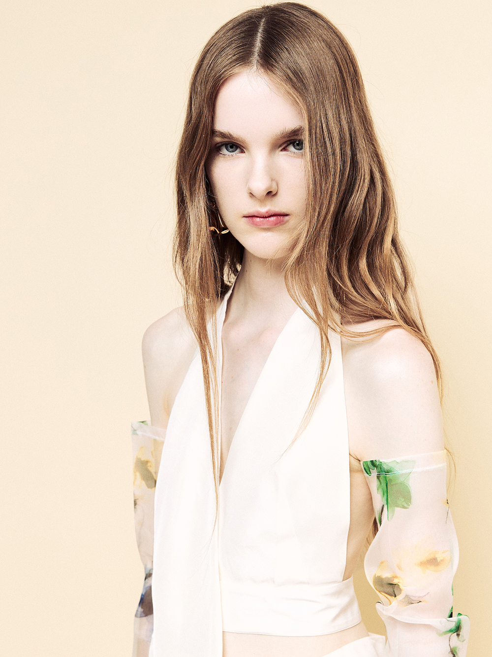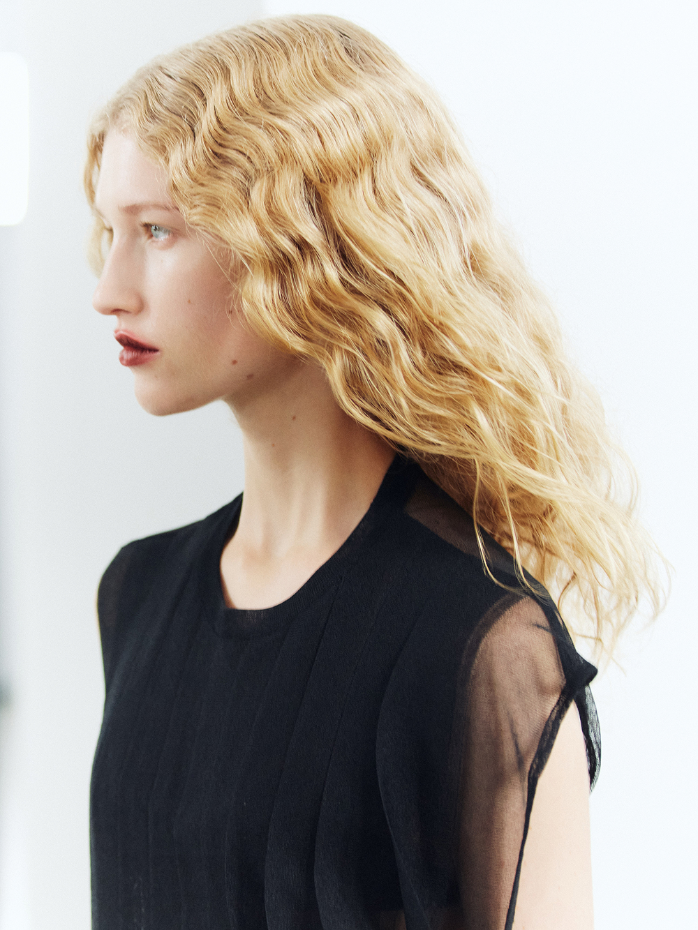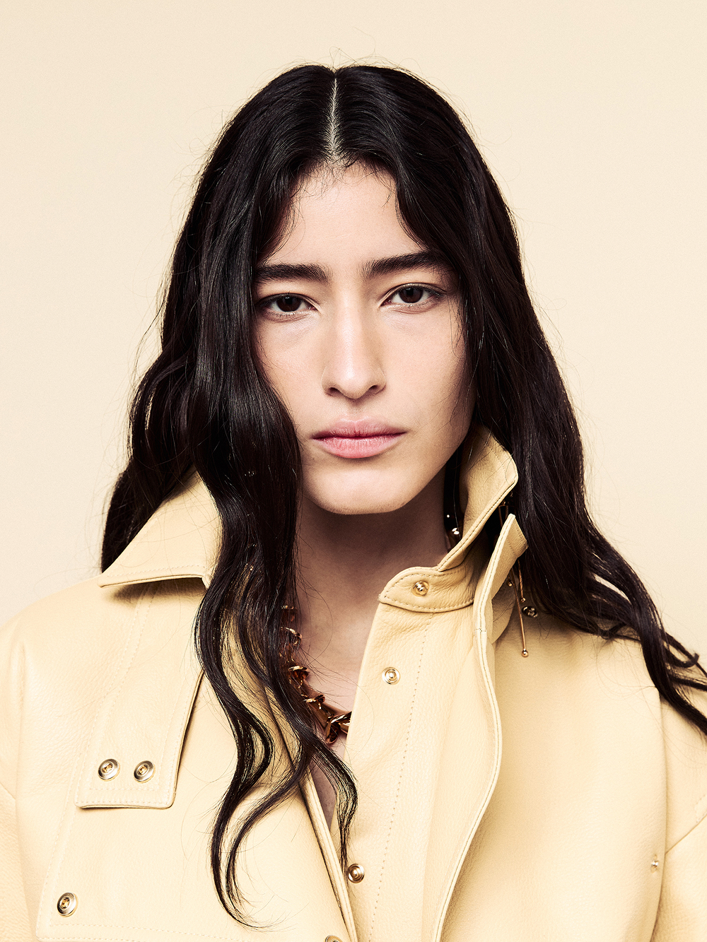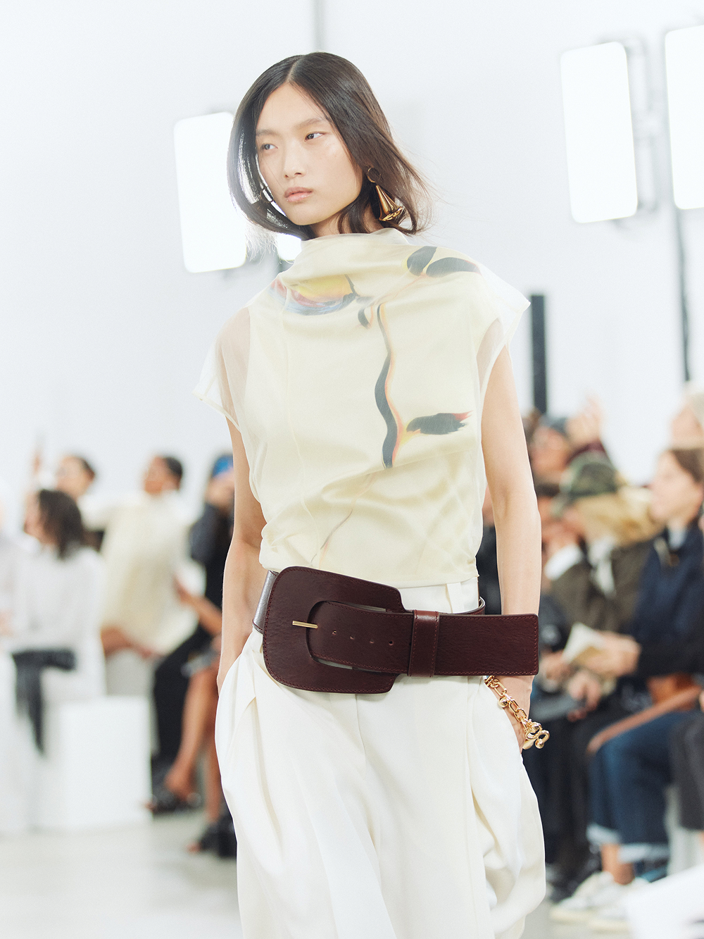 Staged at the historic Frigoriferi Milanesi, the collection experiments with transparency as both surface and language. Layers of gauze and organza refract the body, catching illumination like glass, while pigments—applied with Japanese makeup tools—blur the line between fashion and ritual.