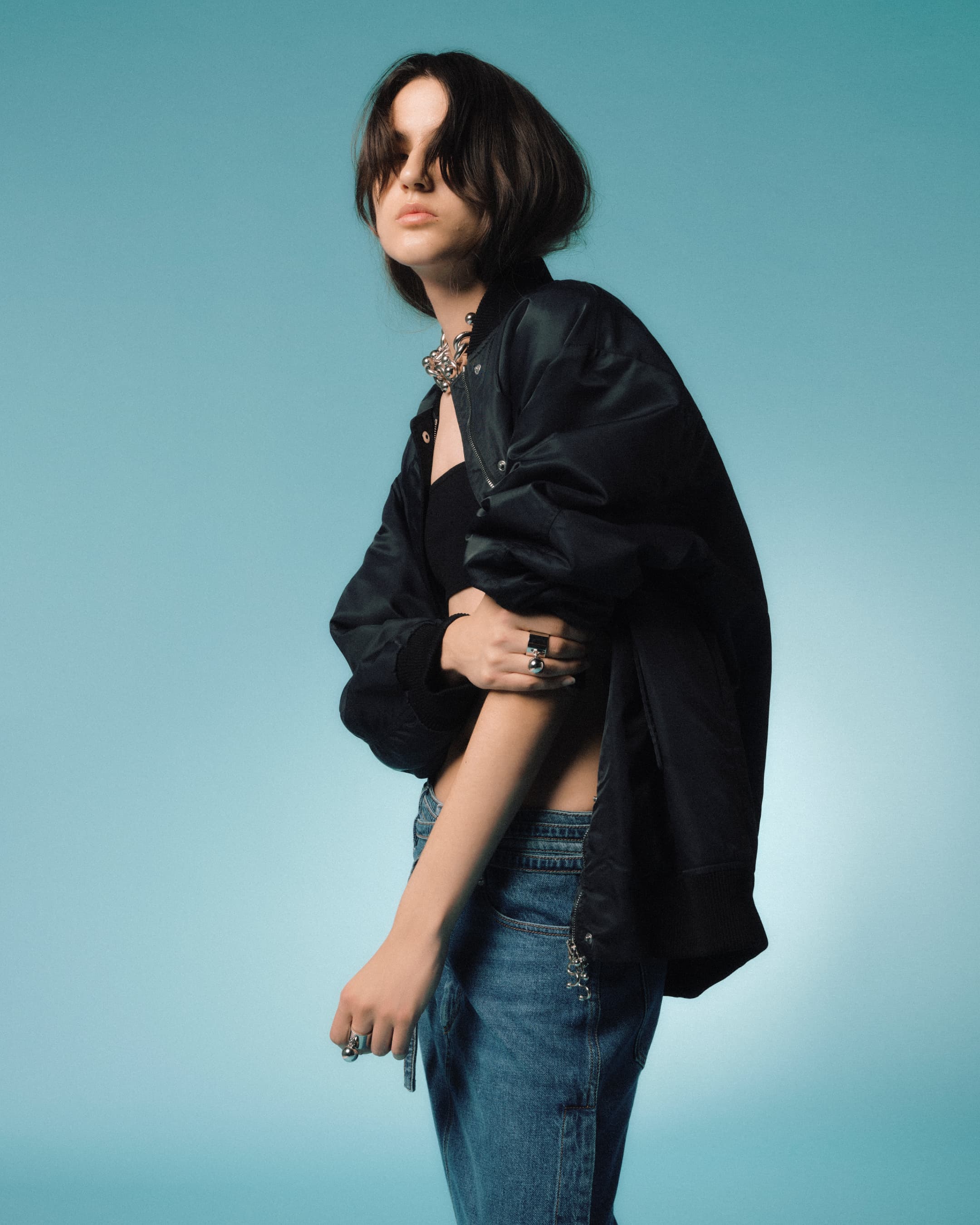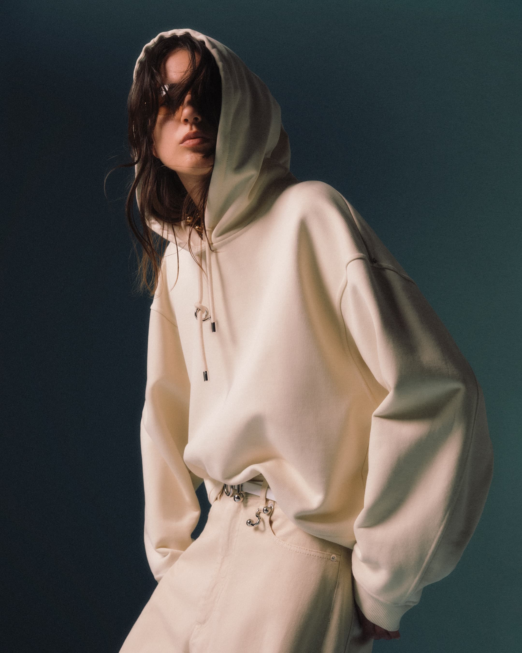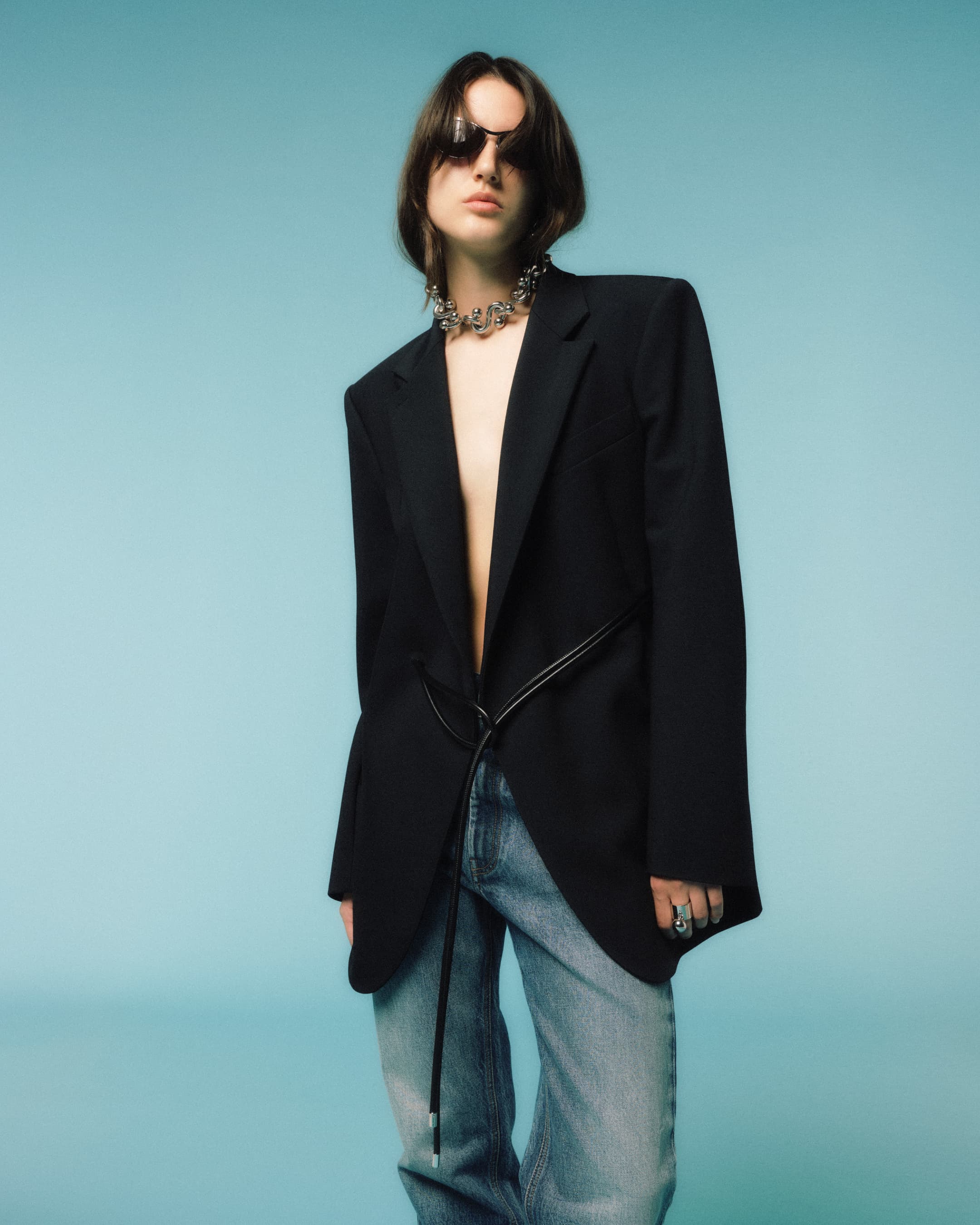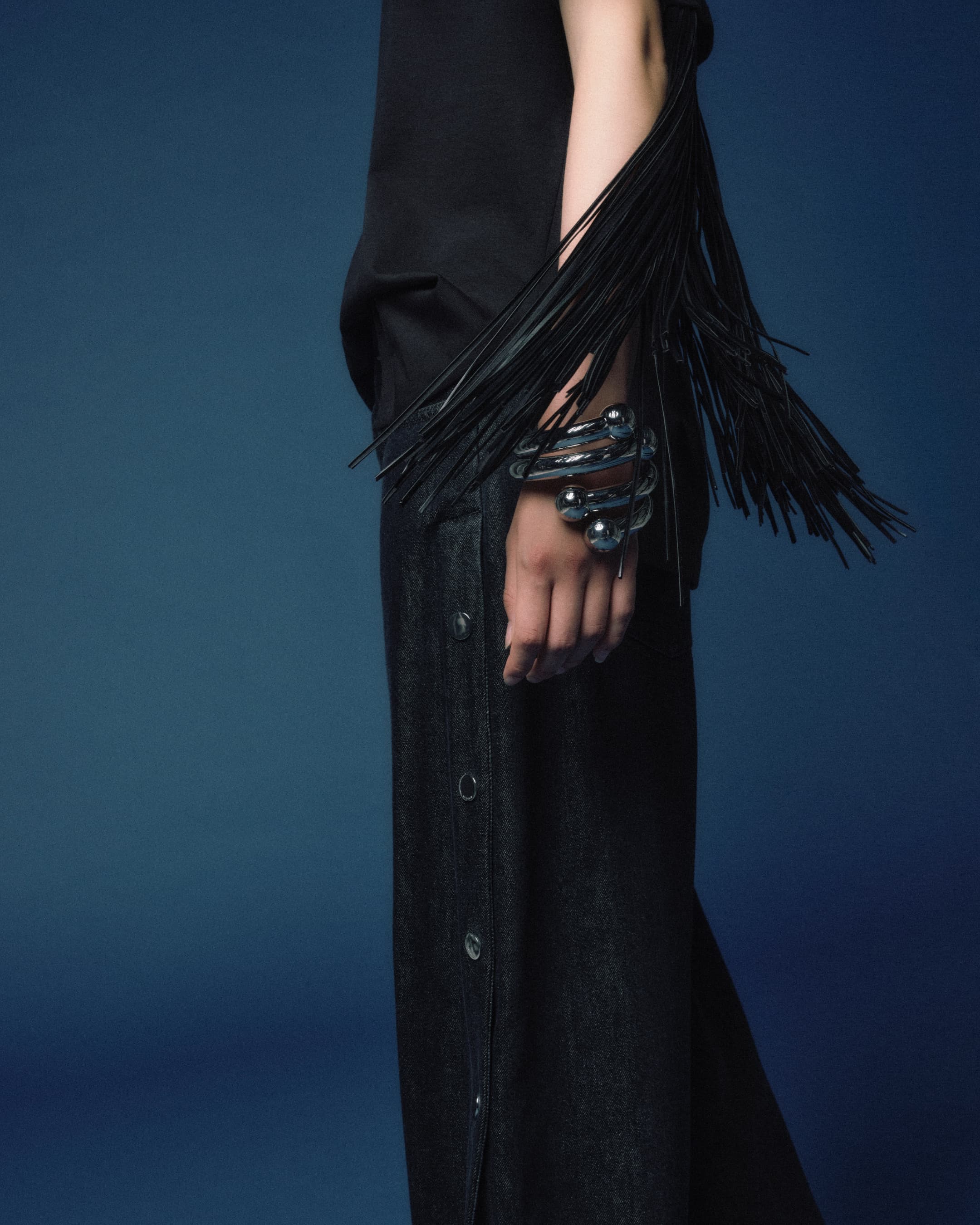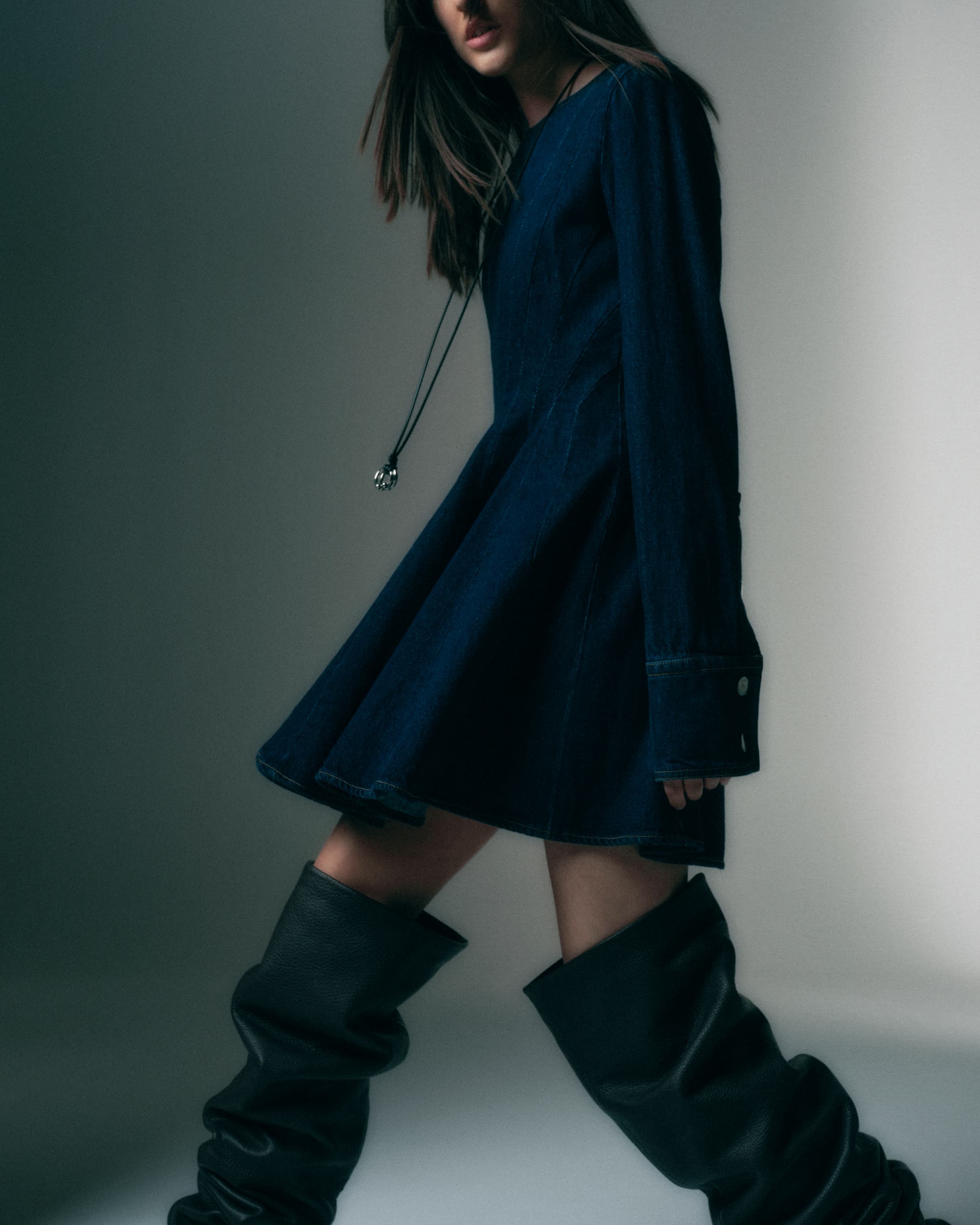 For Fall/Winter 2025, Sportmax approaches denim as a study in contrast and continuity. Inspired by the structure of a Rubik’s Cube, the campaign presents one woman across five distinct moods—each look revealing a different facet, not through transformation, but rotation.